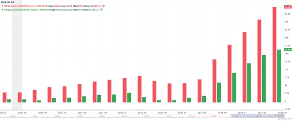 英伟达季度营收和净利润(2020-2024) 来源:Gurufocus