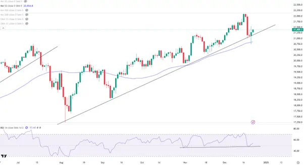 在50天均线和8月末以来的上升趋势线的共同帮助下,纳指周五止跌反弹,周一早盘继续回升,RSI指标再次从中性水平拐头向上,小时级别上指数或能继续修复上周的跌幅,若能否能顺利突破周五高点21550一线,多头将重新掌握主动。