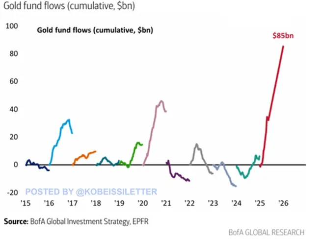 黄金ETF资金流向2015-2025 来源:美国银行,EPFR